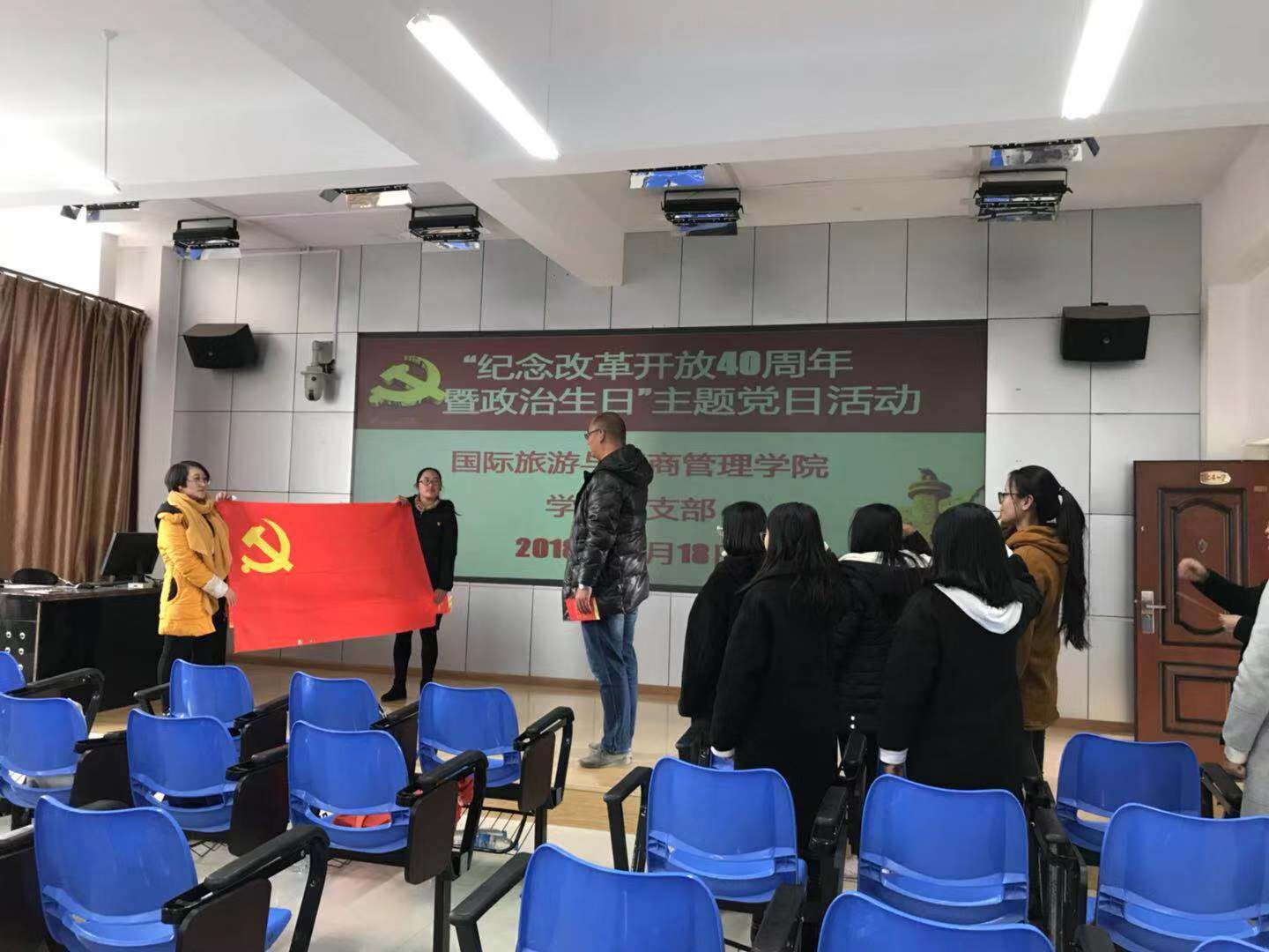以“纪念改革开放40周年暨政治生日”为主题开展支部活动,活动中党支部全体师生党员同志、入党积极分子参会。