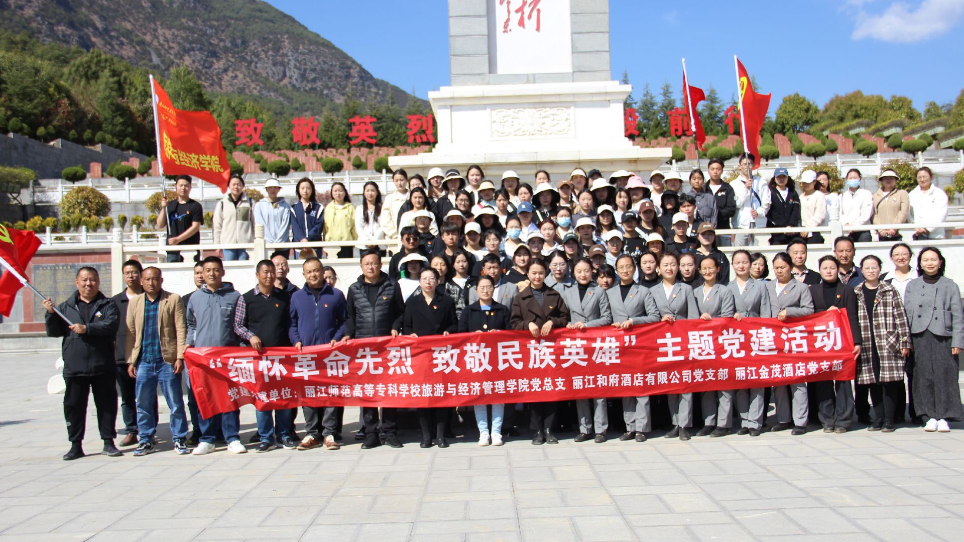 清明节不仅是我们缅怀先烈、祭奠亲人、追思古人的节日,更是我们弘扬爱国主义和传承民族优秀传统文化的重要方式。为深入贯彻落实“立德树人”根本任务,践行社会主义核心价值观,厚植党员和大学生的爱国主义情怀,大力弘扬革命先烈不怕牺牲、艰苦奋斗、敢于斗争的革命精神,2023年3月31日下午,旅游与经济管理学院党总支联合数学与信息技术学院党总支、黑白水林业局党总支、丽江和府酒店有限公司党支部、丽江金茂凯悦臻选酒店党支部开展了“缅怀革命先烈 致敬民族英雄”清明祭扫主题党建共建活动。