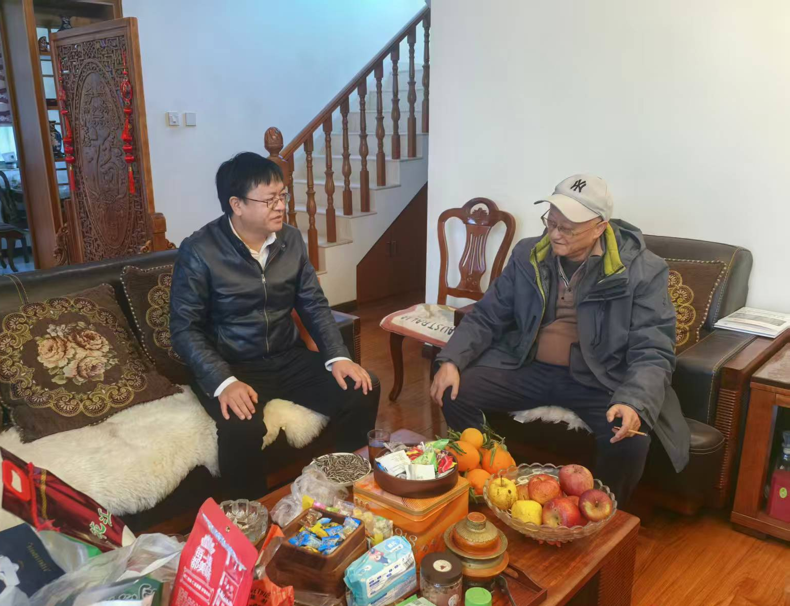 在刘骥老师家中,普荣院长与李继红副书记亲切地与刘骥老师及家人促膝交谈,仔细询问他们的生活起居和身体状况,认真聆听他们讲述在学院工作时期的难忘经历,并向他们介绍了学院近年来在学科建设、人才培养、师资队伍等方面取得的发展成果。