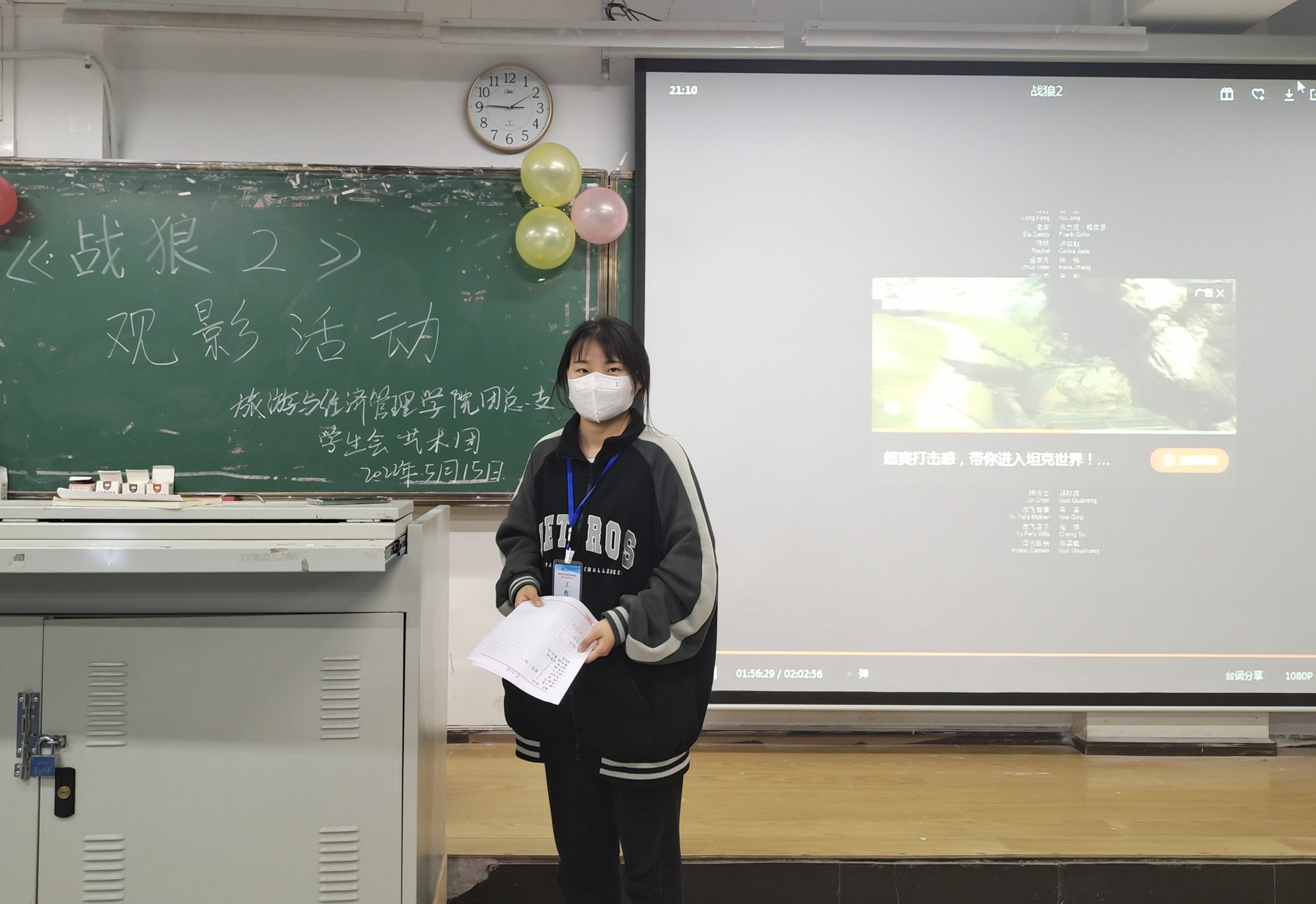 为了让同学们明白中国是维护世界和平与稳定的积极因素和坚定力量,是促进世界经济发展的重要力量。2022年5月15日19:00—21:30旅游与经济管理学院团总支在教学楼222举办了《战狼2》观影活动。