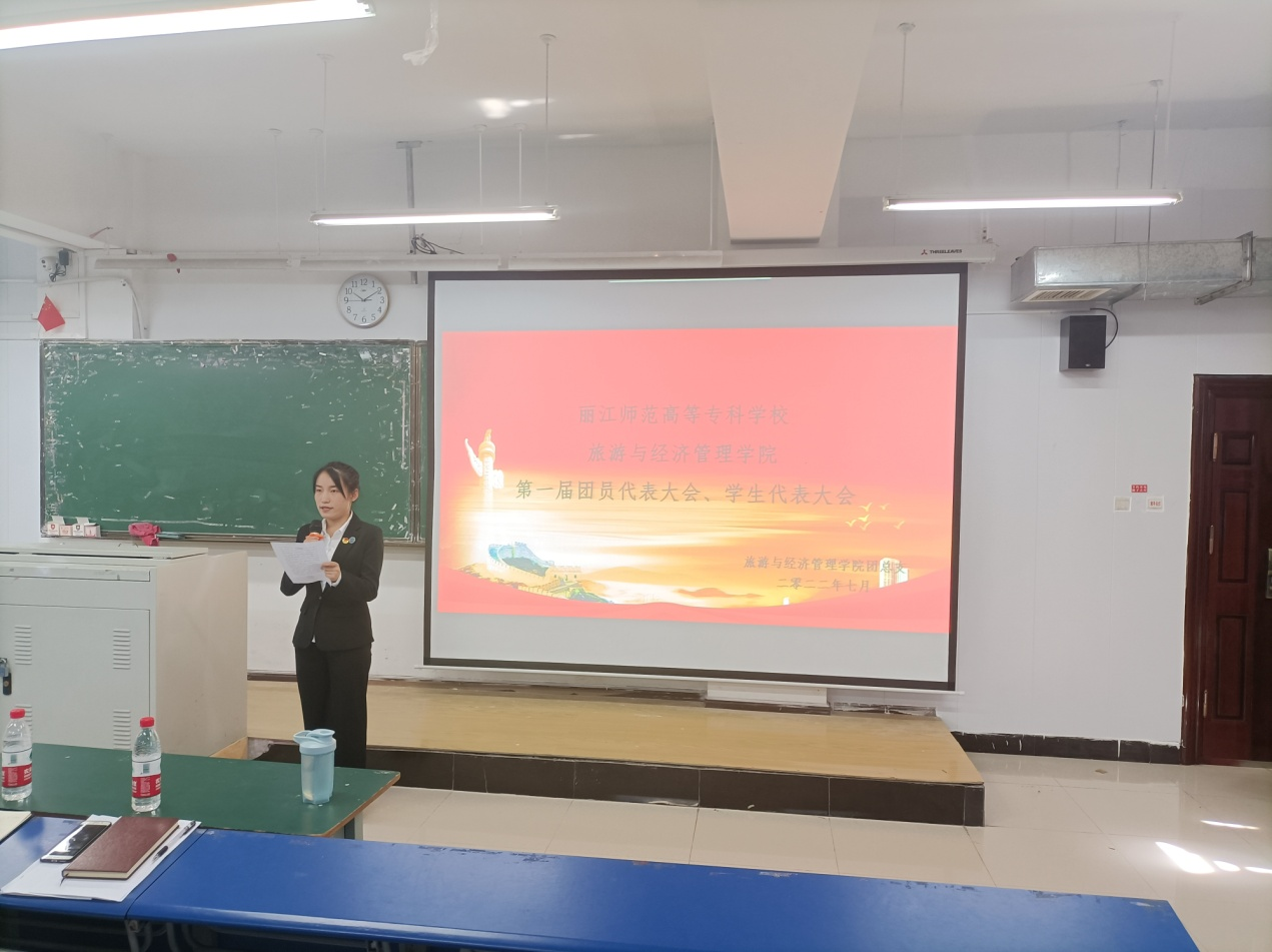 旅游与经济管理学院第一届团员代表大会和学生代表大会于2022年7月4日上午9时30分在教学楼222举行。学校团委卢璘、学院党总支书记高烈明、学院院长和燕杰、学院党总支副书记李继红、学院团总支书记牛永寿、校学生会主席余兴如、学院2021级和2020级各班推选的145学生和团员代表出席本次会议。会议共五个议程,开幕式、2021届团学工作总结及团学干部代表发言、2022届团学干部推选工作汇报、2022届团学干部代表发言、2021届团学干部颁发聘书及闭幕式。