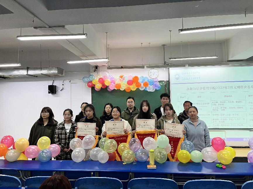 学工办负责人牛永寿宣读了获得2023年5月“文明宿舍”荣誉称号的宿舍名单。获月文明宿舍荣誉称号的宿舍长代表2022级电子商务一班杜苏悦、2021级会计一班易吉顺分享了文明宿舍创建经验。参会领导、辅导员和班主任向获得5月文明宿舍的成员颁发了奖状。