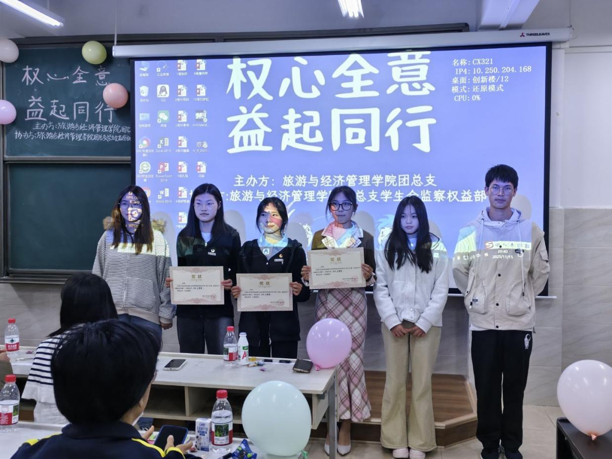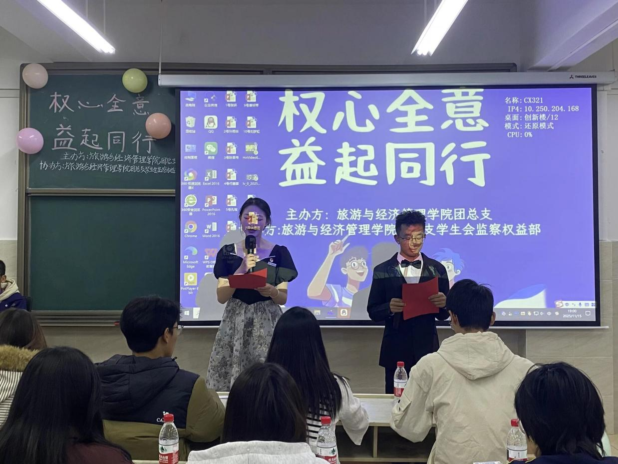 为深入学习贯彻党的二十大精神,切实提升青年学生的权益维护意识与社会责任感,2025年11月15日,旅游与经济管理学院团总支在创新楼314举办了“权心全意 益起同行”主题演讲比赛。本次比赛旨在引导广大同学关注自身及他人合法权益,营造和谐、公正、互助的校园文化氛围。