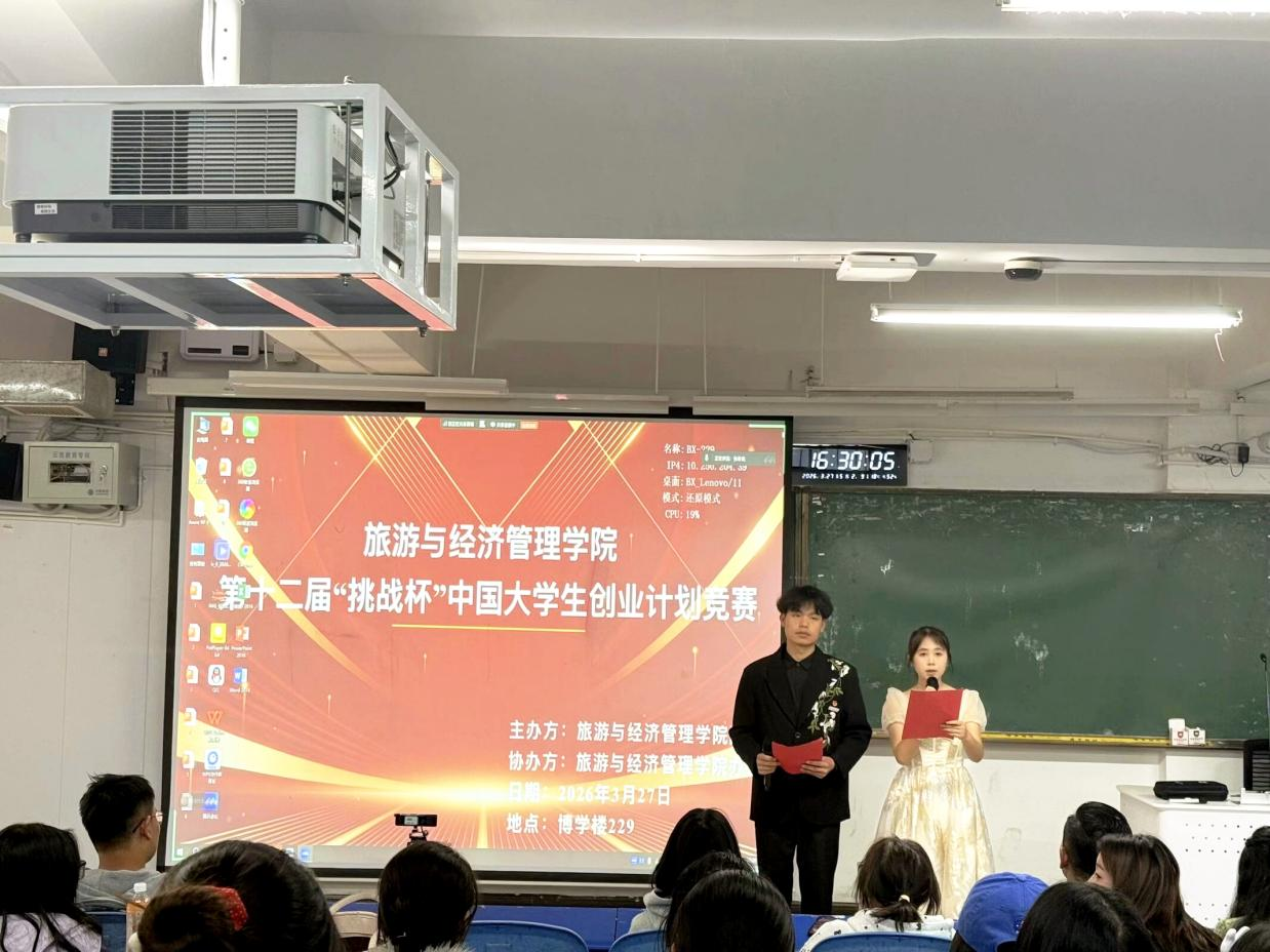为深入贯彻国家“大众创业、万众创新”战略,落实创新驱动发展与科教兴国战略部署,搭建大学生创新创业实践平台,旅游与经济管理学院于2026年3月27日在博学楼229成功举办第十二届“挑战杯”中国大学生创业计划竞赛活动。学院师生齐聚一堂,共同见证这场创新创业风采的展示与交流。