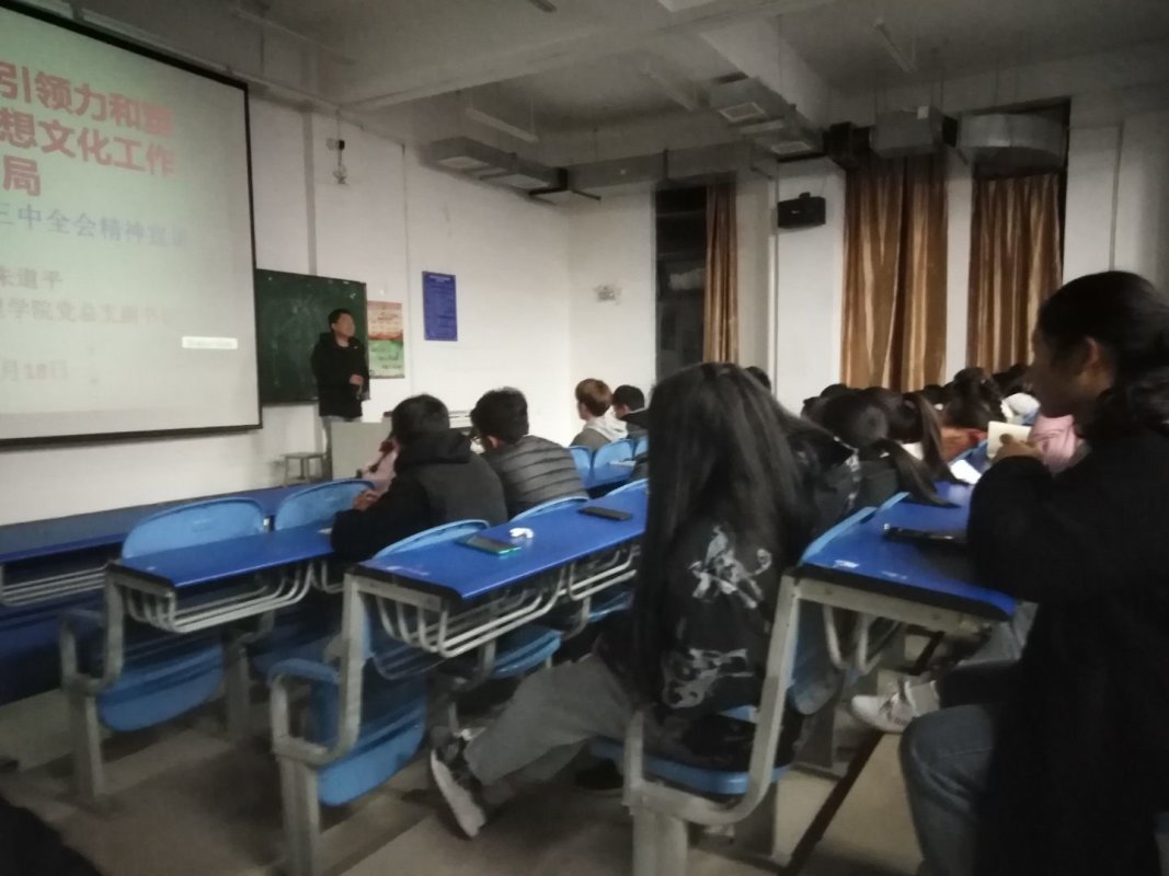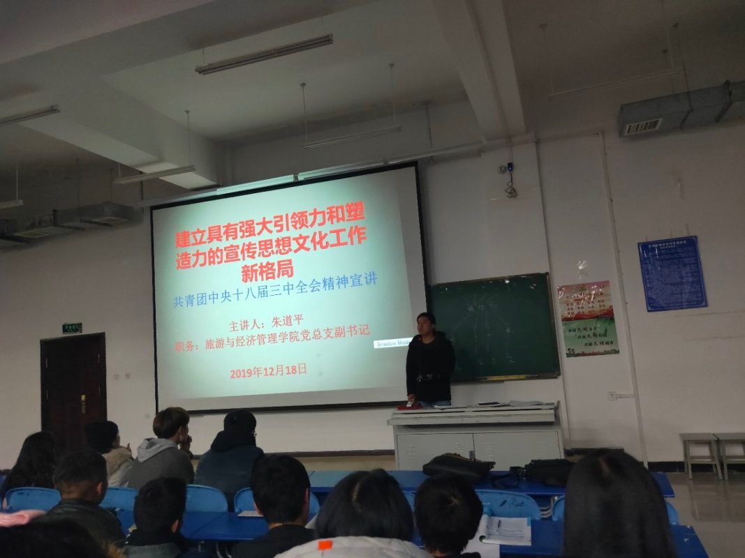 为进一步宣传学习党的十九届四中全会精神,同时,学习宣传团的十八届三中全会精神,积极引导青年大学生牢固树立正确的理想信念,培育正确的世界观、人生观、价值观,塑造优秀的学风,宣传新时代思想文化。旅游与经济管理学院于2019年12月18日晚在教学楼324举办了“党的十九届四中全会、共青团中央十八届三中全会”学习宣讲活动。学习宣讲由旅游与经济管理学院党总支副书记朱道平主讲,学院团总支、学生会、班级班委、学生代表近300余人参加。