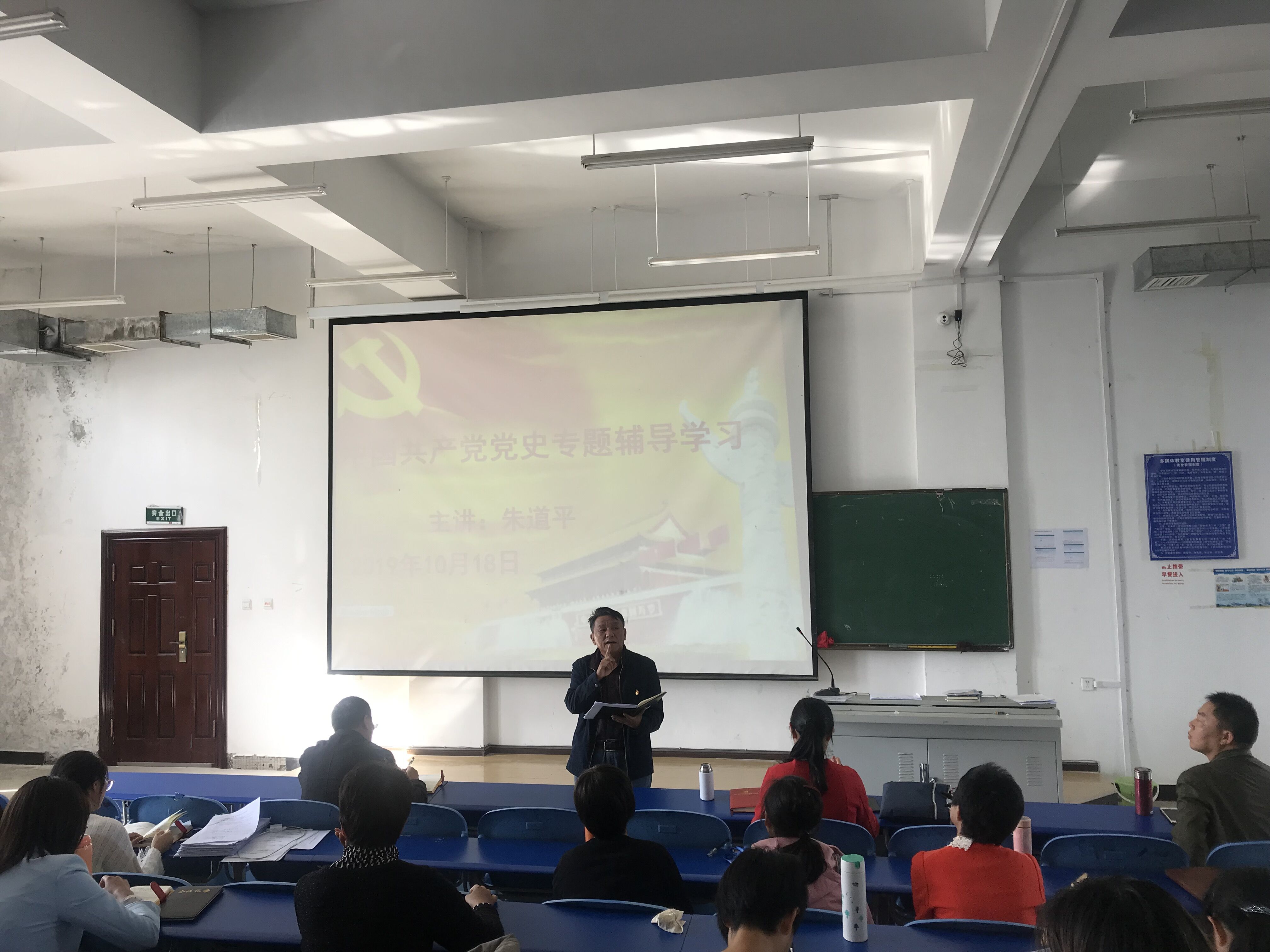 根据学校“不忘初心 牢记使命”主题教育工作安排,结合旅游与经济管理学院工作部署,切实牢固习近平新时代中国特色社会主义思想为指导,增强“四个意识”,坚定“四个自信”,做到“两个维护”,教育引导广大师生了解党史、新中国历史,切实做到守初心、担使命,2019年10月18日下午,旅游与经济管理学校党总支在教学楼324举行“不忘初心 牢记使命”之党史、新中国史专题辅导讲座,讲座由学院党总支副书记朱道平主讲,学院党总支书记沈紫拉主持讲座,学院全体教师、团学干部、学生党员、入党积极分子、递交入党申请书申请人等参加。
