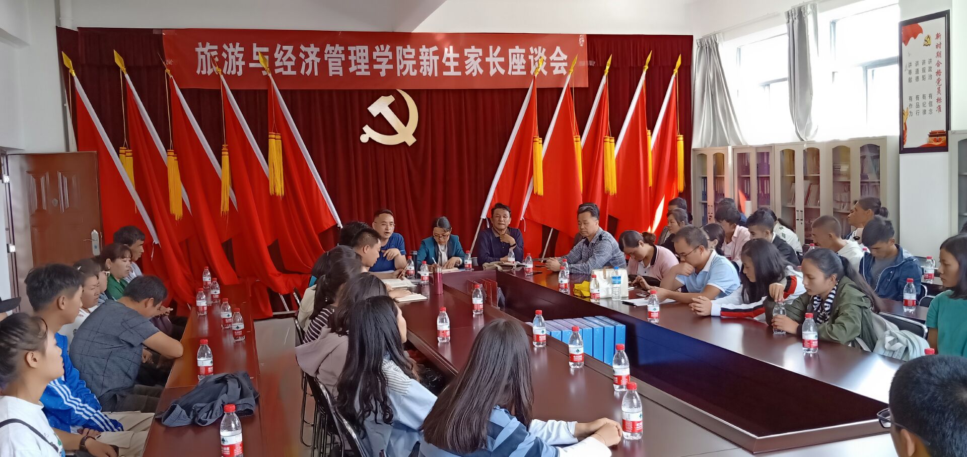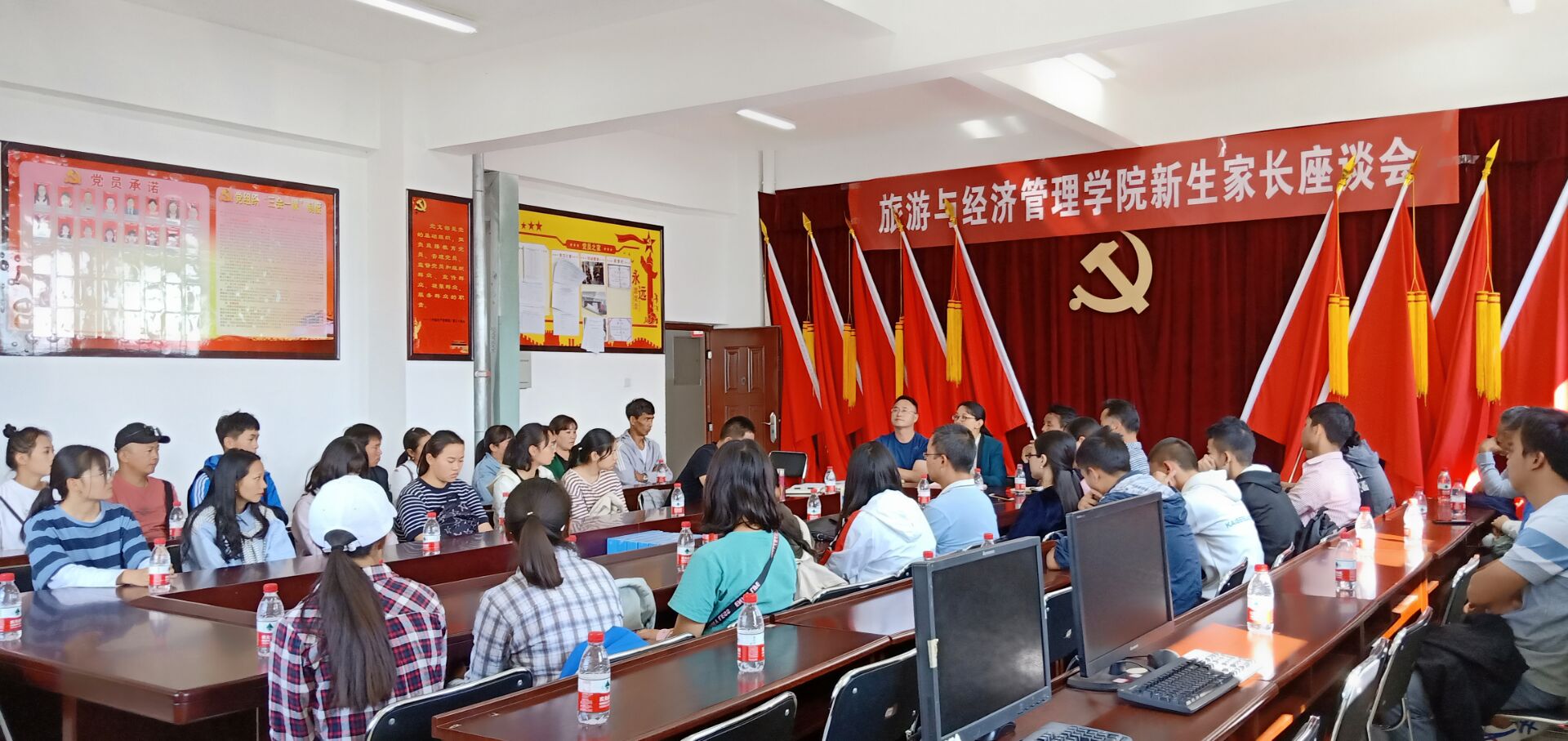 2019年8月25日上午10点,为进一步做好立德树人,服务好新生及家长,旅游与经济管理学院在实训楼615举行2019级新生及家长座谈会。座谈会由学院党总支书记沈紫拉主持。杨小明、和燕杰、朱道平等院领导参加会议,学校教务处处长王成及专业负责人李章红、唐俊波、白海霞、王丽坤等和新生代表、家长50余人参加会议。