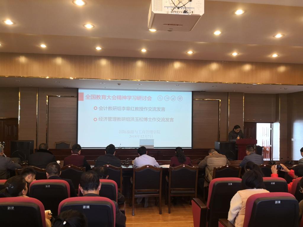 为进一步加强教职工的国情国史和国家安全教育,深入贯彻落实党的十九大精神和全国全省思想政治工作会议精神,2018年12月7日,13:00,国际旅游与工商管理学院举行全院教职工集体培训,深入学习贯彻全国教育大会精神和《师德师风相关规定》等学习,会议由学院院长杨小明主持,全院教职工参加了本次集中培训。