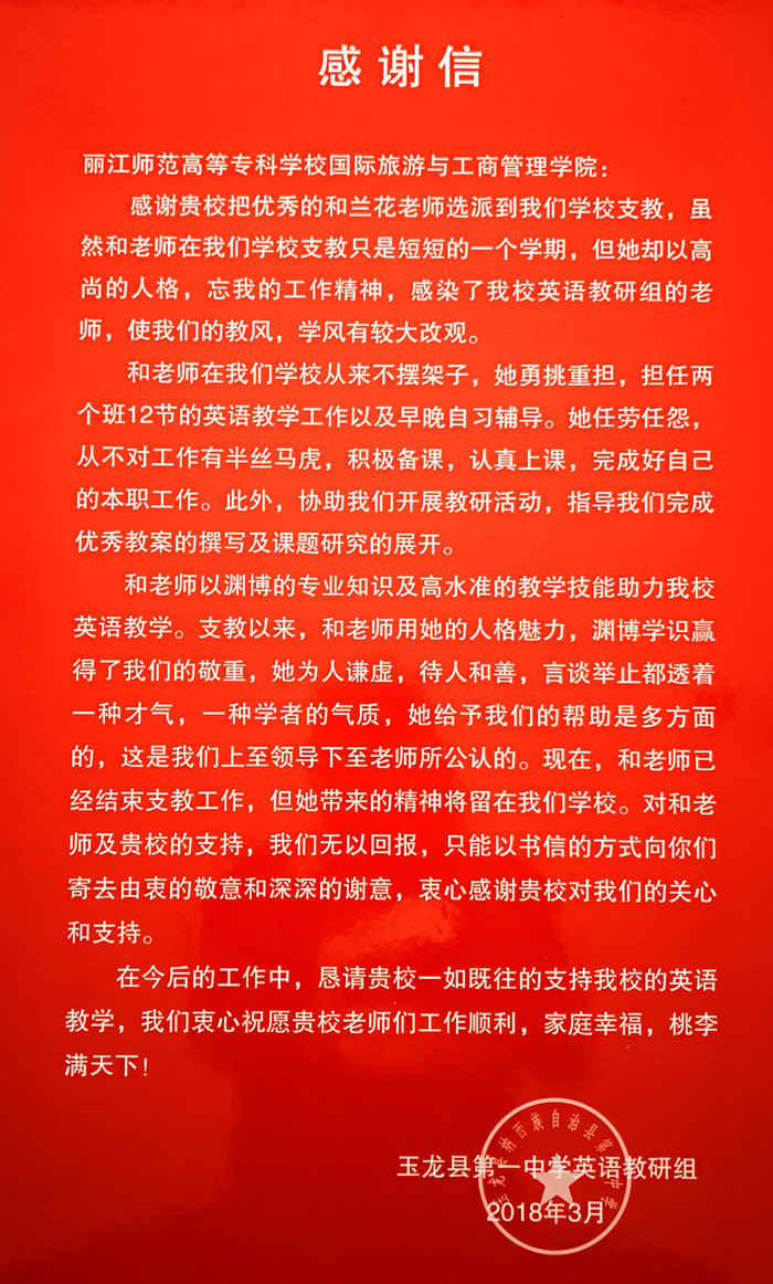 2018年5月15日,丽江师范高等专科学校国际旅游与工商管理学院收到了两封来自玉龙县第一中学的感谢信。