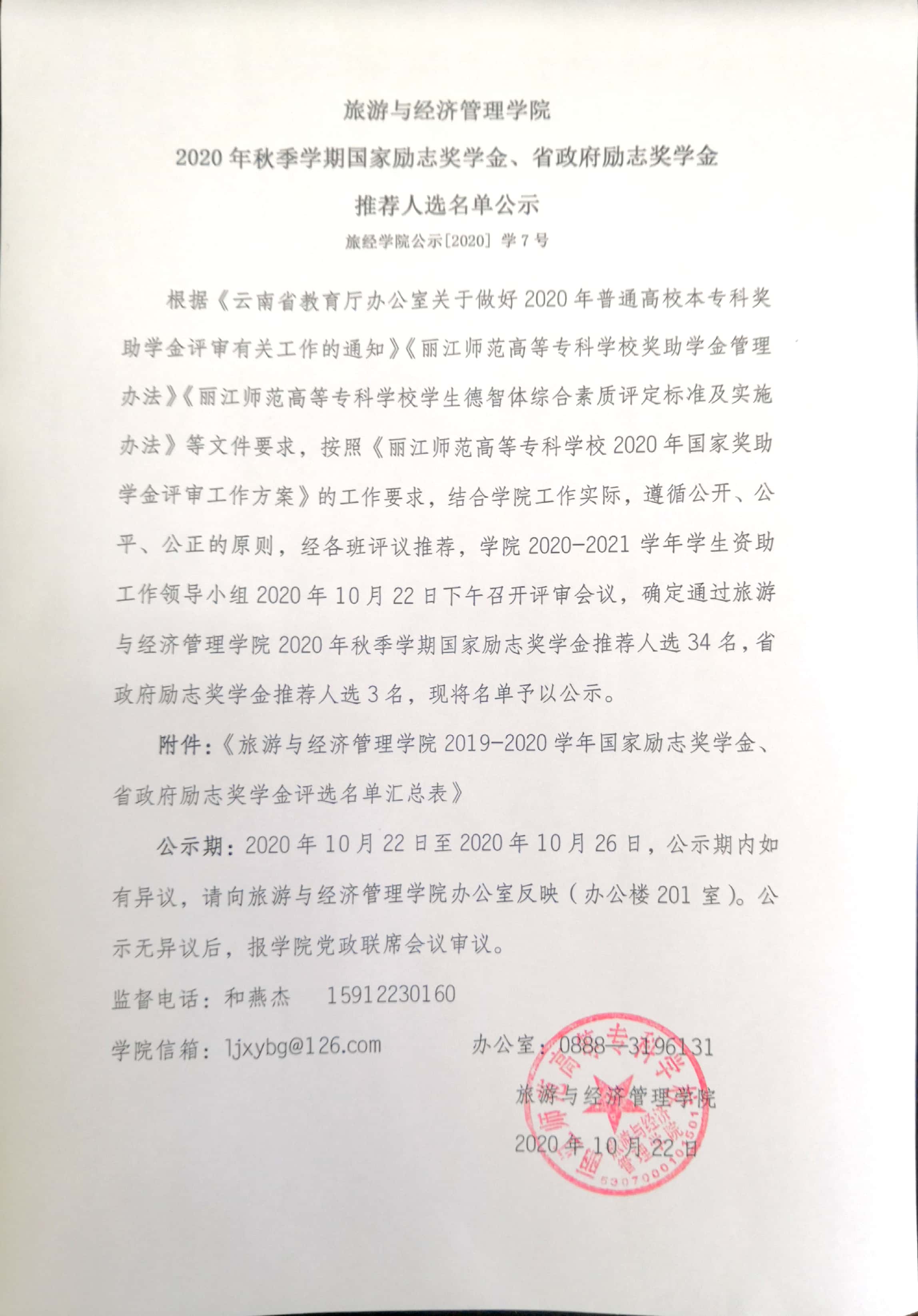 旅游与经济管理学院2019-2020学年国家励志奖学金、省政府励志奖学金推荐人选公示