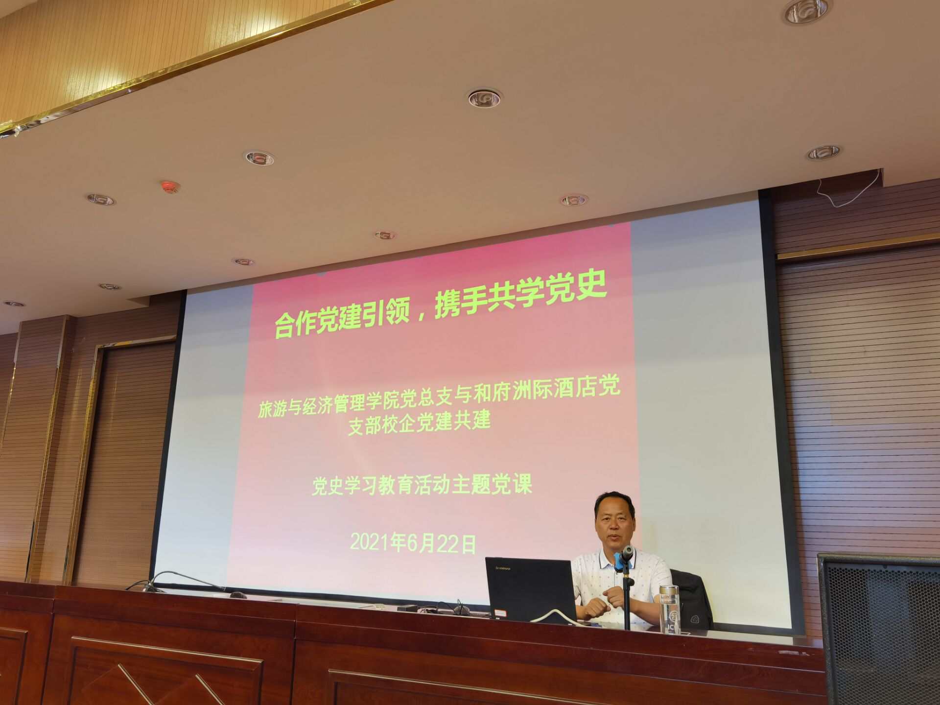 2021年6月22日下午,旅游与经济管理学院党总支与丽江和府洲际酒店党支部在丽江师范高等专科学校实训楼318报告厅共同开展了“读毛泽东诗词 学共产党历史”的党建共建党课,参与党课学习的同志有来自和府洲际酒店党支部的党员同志,旅游与经济管理学院党总支所属全体党员同志,入党积极分子,以及部分团学干部共200余人,党课由旅游与经济管理学院党总支书记高烈明同志主讲,党课主要内容包括以下几个方面: