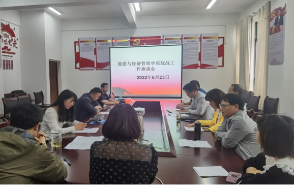2022年6月23日中午13:00,旅游与经济管理学院在实训楼220会议室召开统战工作座谈会。学院党总支书记高烈明、党总支副书记、院长兼统战委员和燕杰、教师党支部统战委员张玉美、学生党支部统战委员吴晓莉及民主党派、无党派、群众教师参加了会议,会议由和燕杰主持。