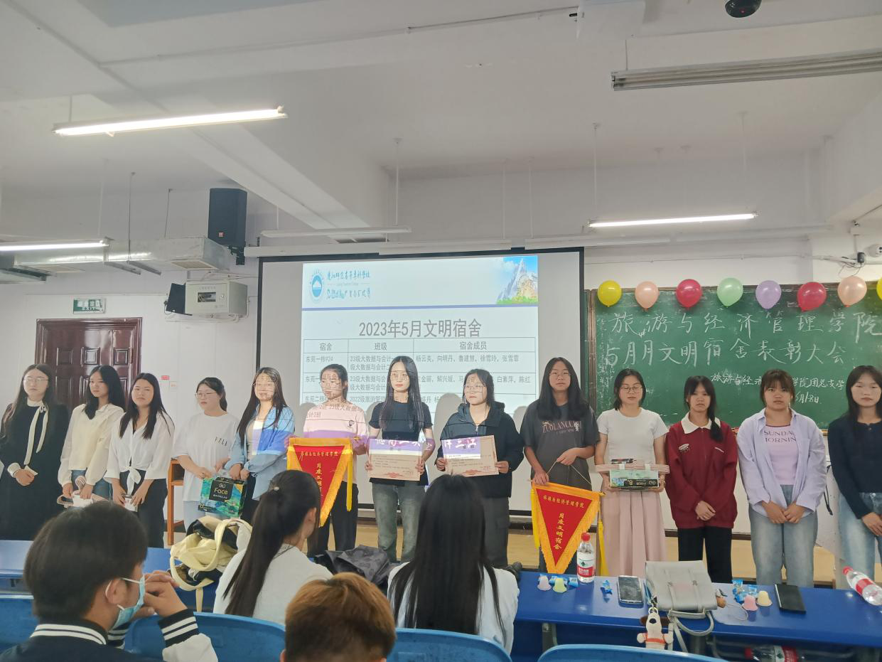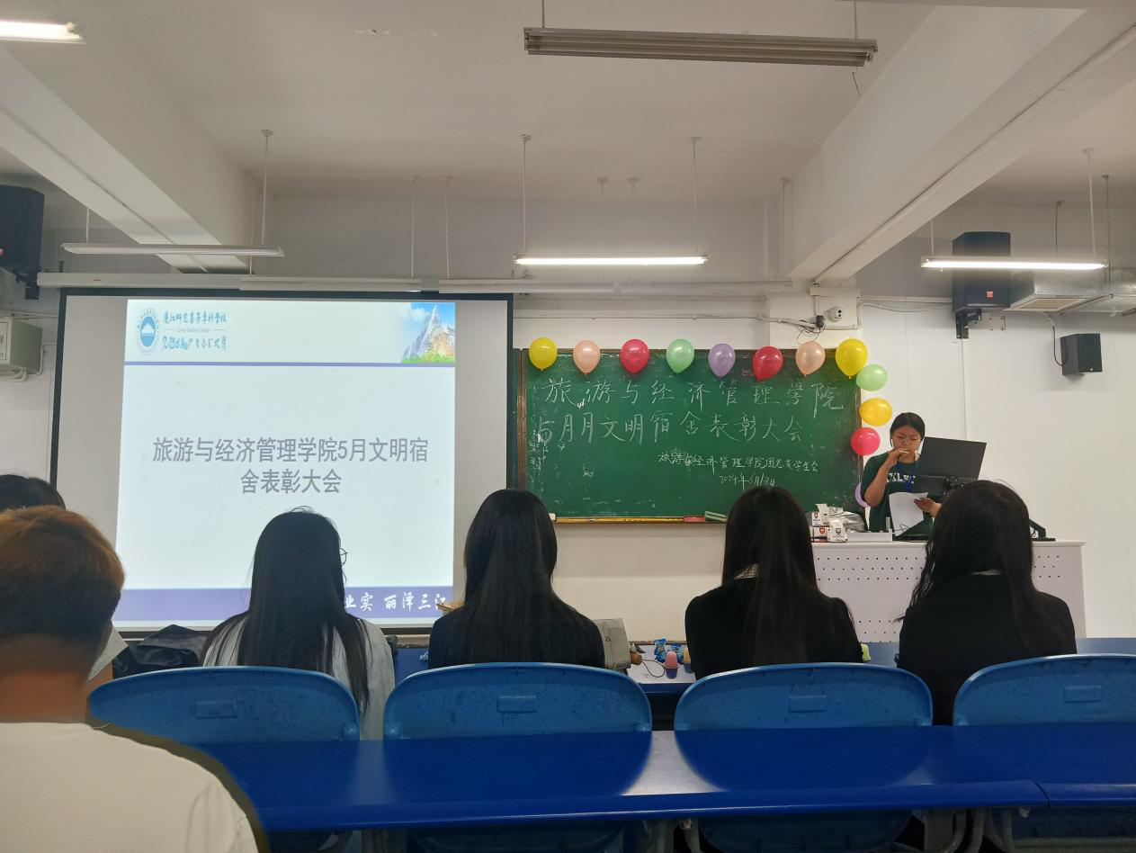 本次月文明宿舍是我院监察权益部根据各宿舍的卫生情况、环境布置、团队合作精神等多方面进行细致评分评出的。获得5月份文明宿舍称号的是:2023级酒店管理与数字化运营1班、2班东苑4栋304宿舍、2022级大数据与会计1班东苑4栋1103宿舍、2023级大数据与会计1班、2班东苑1栋924宿舍、2023级大数据与会计1班、3班东苑1栋1005宿舍、2022级旅游管理1班东苑2栋425宿舍。会上,获得文明宿舍荣誉称号的宿舍长代表2023级大数据与会计2班徐雪玲、2023级酒店管理2班杨义成为同学们分享了文明宿舍创建经验。