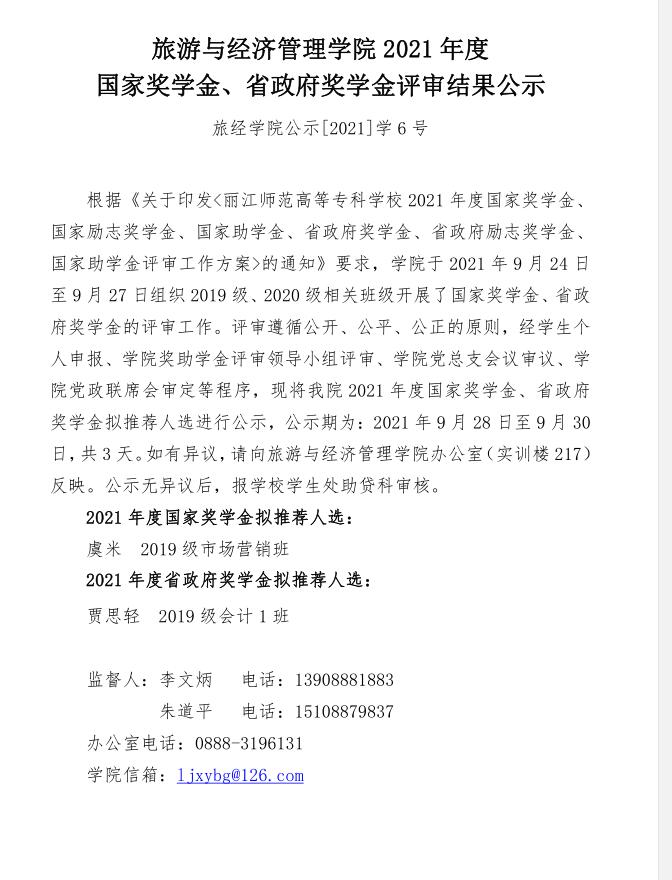 旅游与经济管理学院2020-2021学年度国家奖学金、省政府奖学金推荐人选公示
