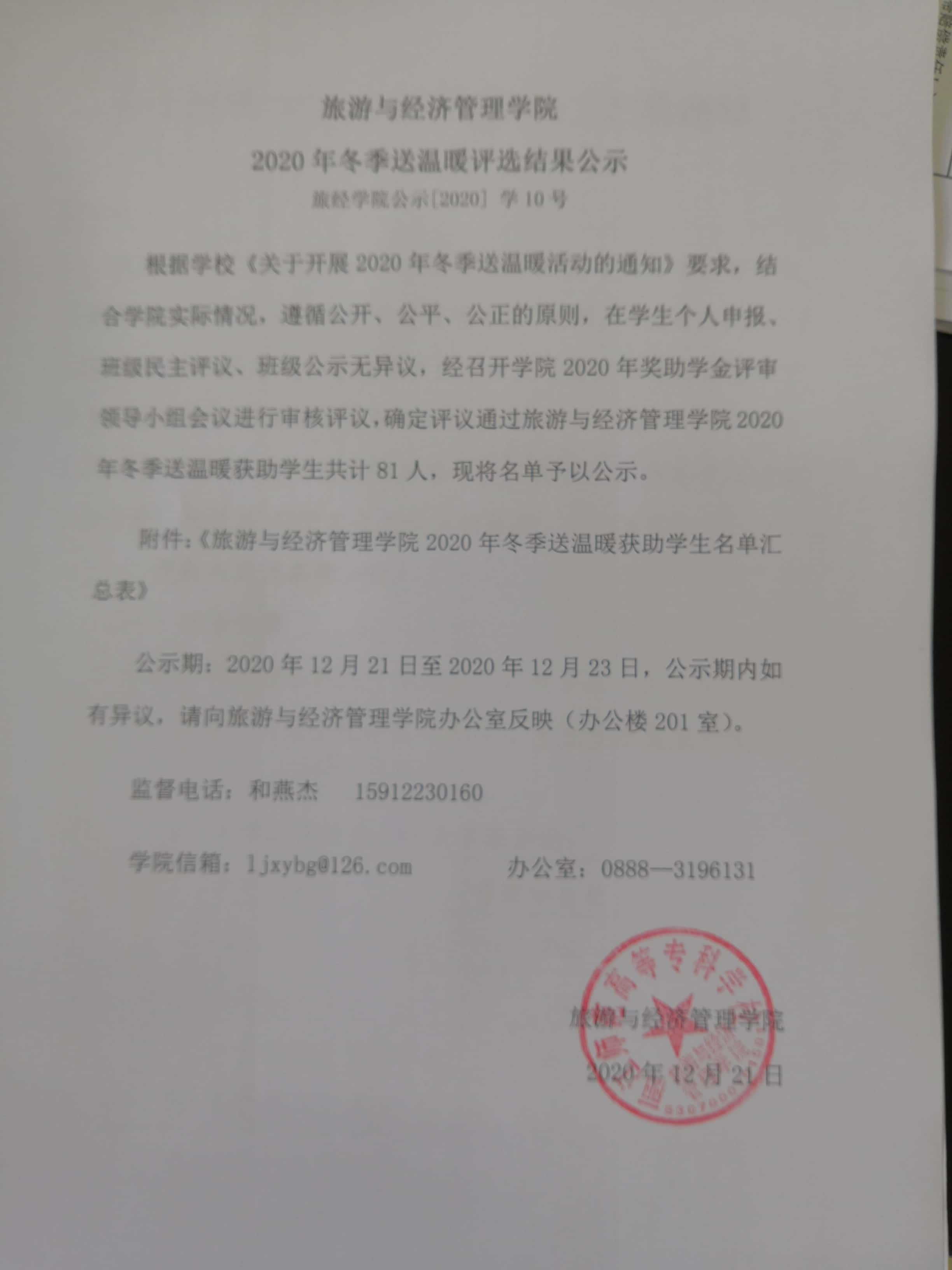 旅游与经济管理学院2020年冬季送温暖活动评选结果公示