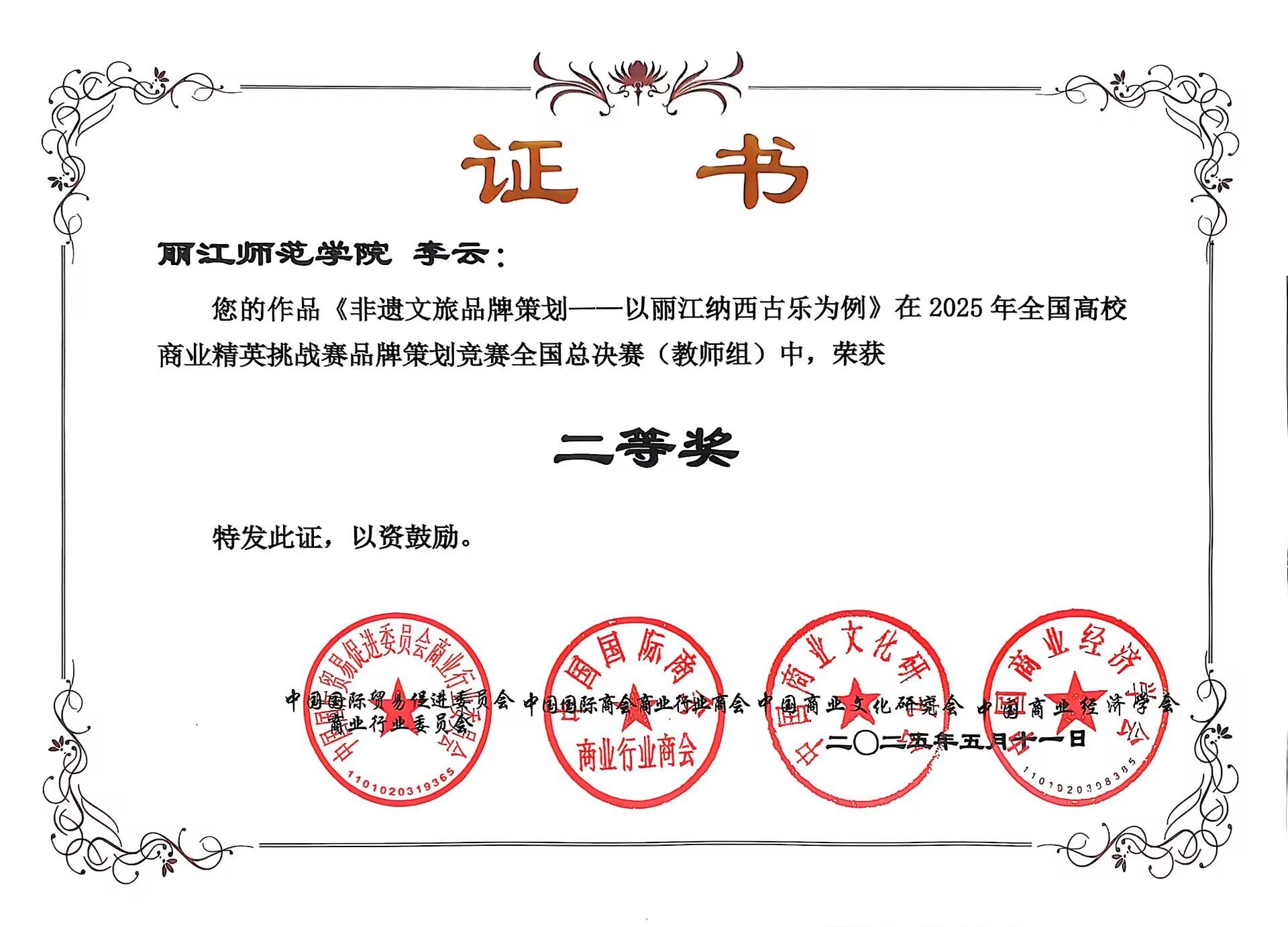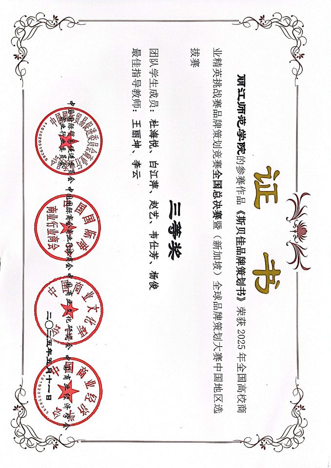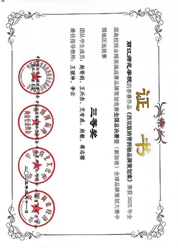 近日,2025年全国高校商业精英挑战赛品牌策划竞赛全国总决赛暨(新加坡)全球品牌策划大赛中国地区选拔赛圆满落下帷幕。丽江师范学院2023级、2024级电子商务专业的18名学生分3个组,电子商务专业李云、王丽坤、和雪刚3名教师分别参加了此次学生组、教师组比赛,凭借扎实的专业知识和出色的团队协作,学生组斩获3个三等奖,3位老师荣获教师组二等奖,为学校争得了荣誉。