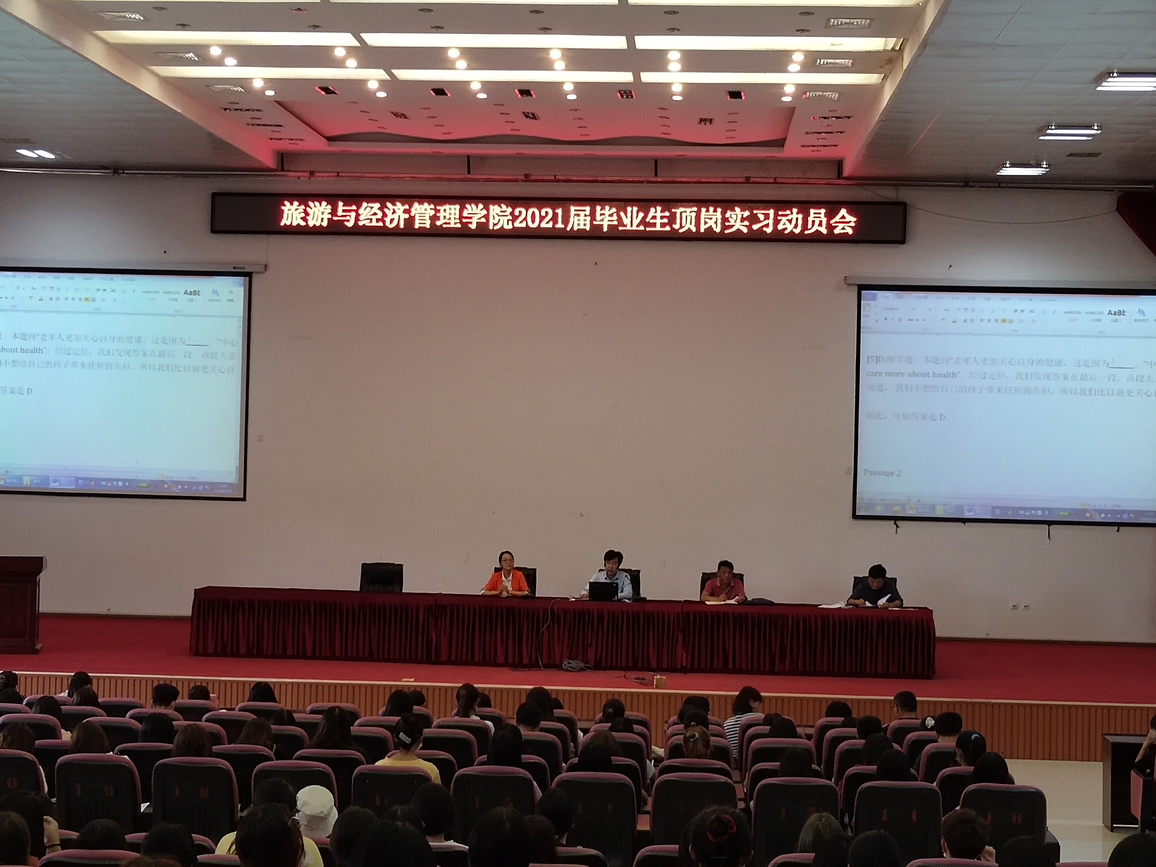 2020年7月16日13:00,旅游与经济管理学院在图书馆报告厅召开了2021届毕业生顶岗实习动员大会。学院全体教师、2021届全体毕业同学参加了此次大会,蒋广峰博士受邀参会会议,会议由和燕杰副院长主持。