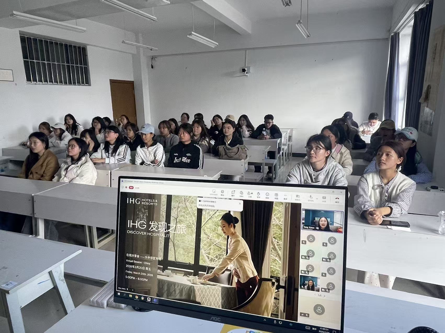 为深化校企协同育人,拓宽学生行业视野,明晰职业发展路径,2026 年 3 月 20 日,洲际英才培养研习中心2024级、2025级洲际英才班全体学生共同参与了由洲际酒店集团IHG)主办的“IHG 发现之旅—职业启航在线分享会”与行业专家云端对话,共探酒店与旅游行业发展新机遇。